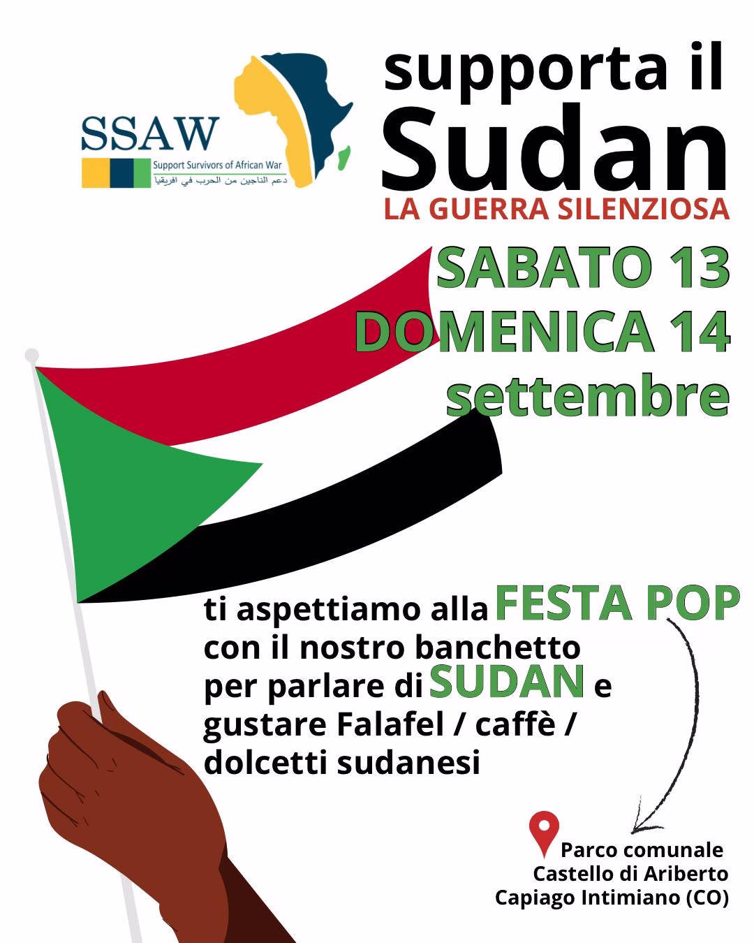 On September 13, SSAW – Support Survivors of African War participated in Festa Pop at the Parco Comunale Castello di Ariberto in Capiago Intimiano. The organization was present with a stand to raise awareness about the ongoing conflict in Sudan and to support its humanitarian programs.